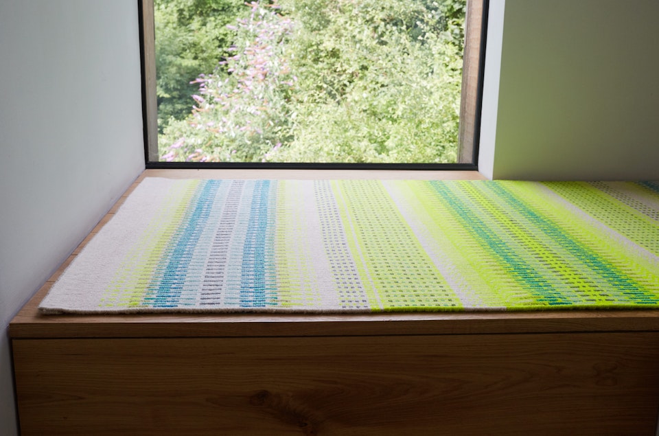 Influenced by Bristol's thriving urban art scene, a year spent living in India and a lifelong passion for this time honoured rug weaving technique, this piece is hand woven by Angie Parker in her Bristol workshop with skill and joy, and brings a fearless blast of colour and energy to any interior.