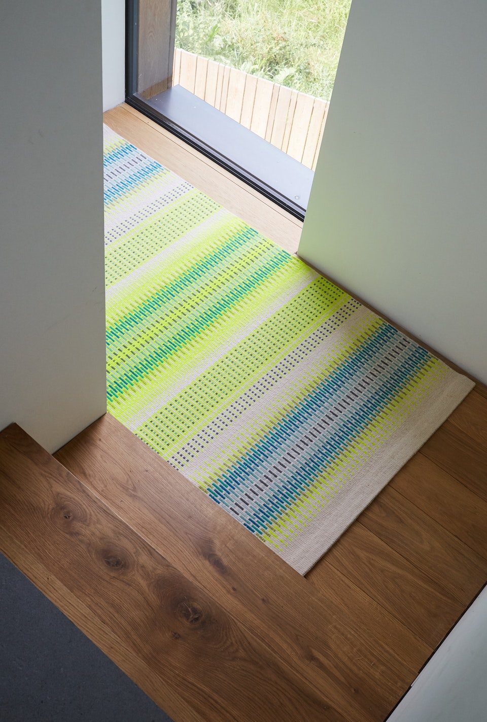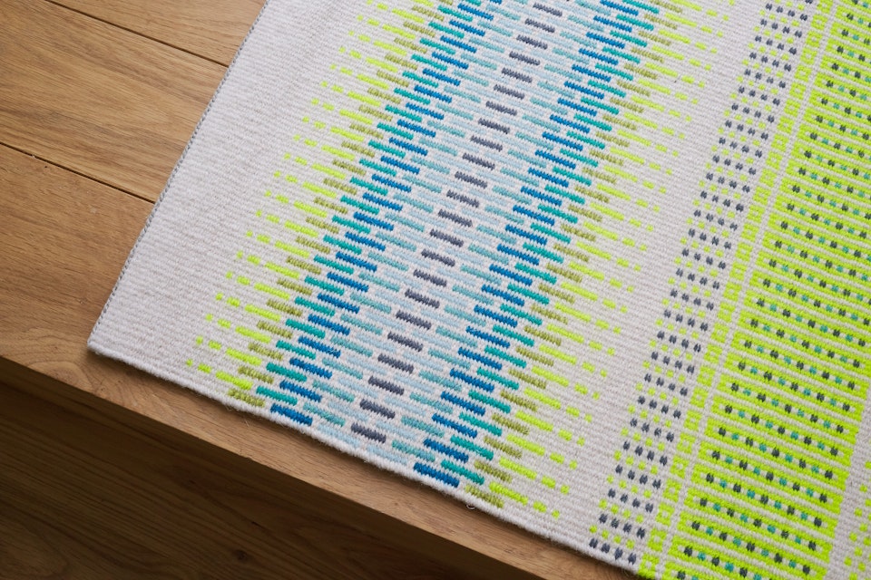 This vibrant rug or piece of floor art combines the traditional Scandinavian 3 shaft, weft-faced rug technique (Krokbargd) with a bold palette of contemporary colours.