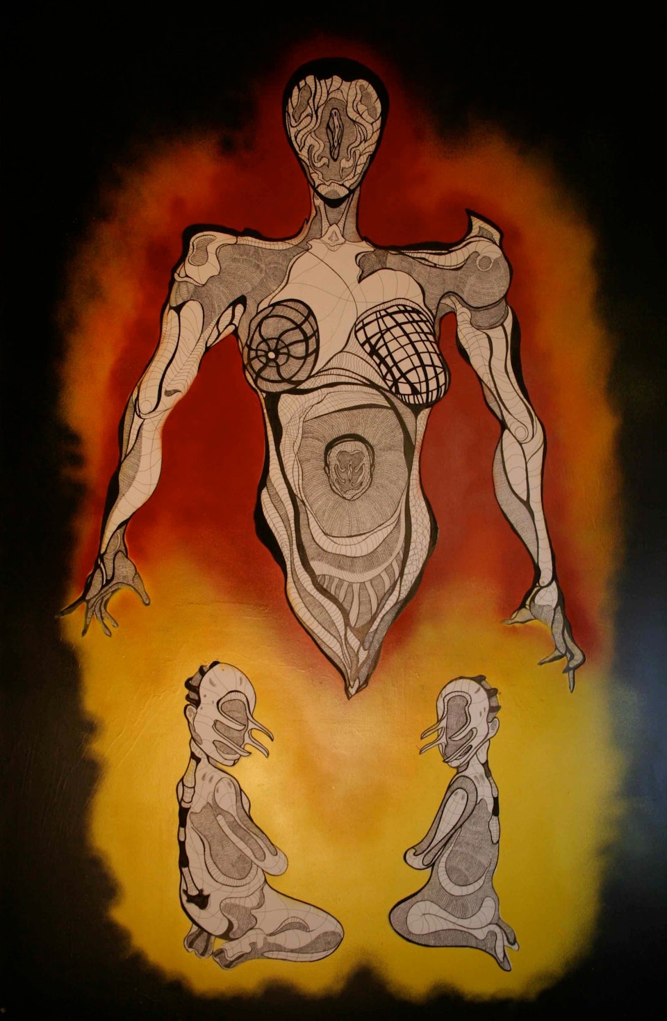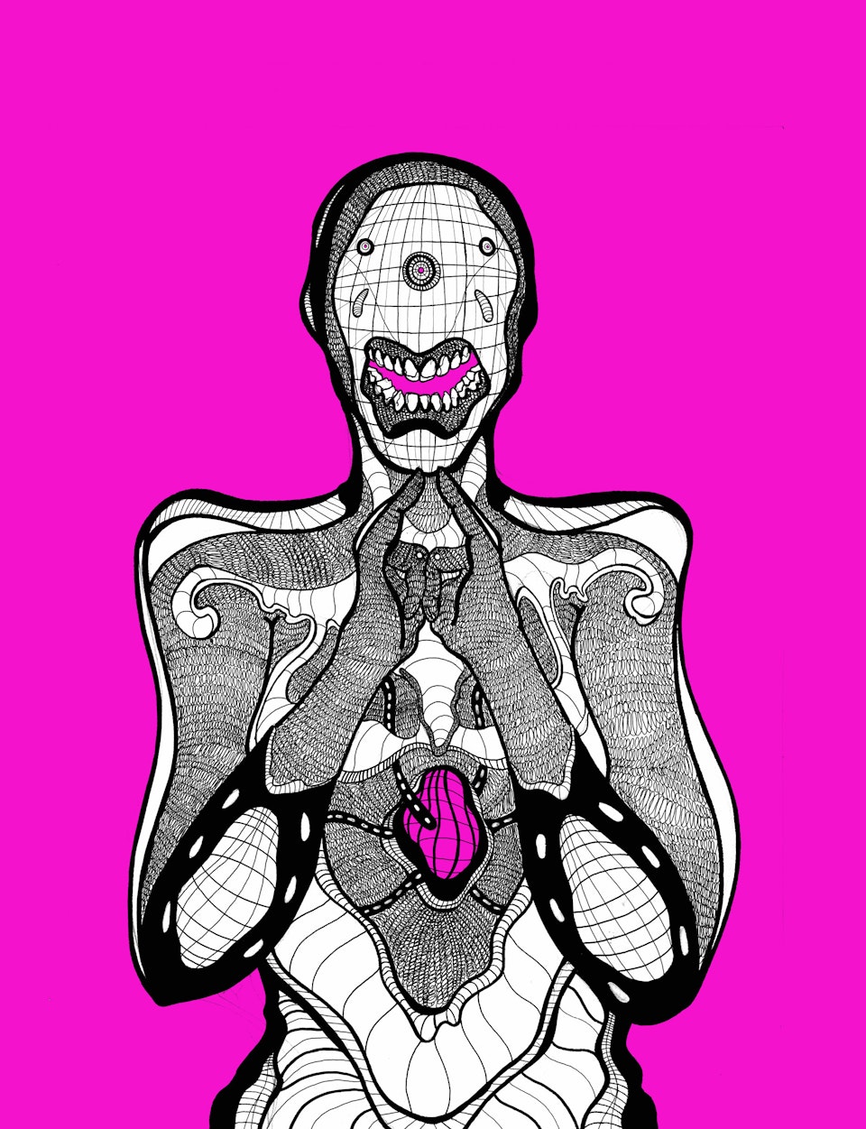 They are infantile and simplistic in their appearance but not in their construction, being drawn in one continuous line. My visual discourse is motivated by transcribing the sociological constructions of our age, the evolution of the flesh its reflection of the coming state of mankind, flesh anxiety, the departure into a new being."