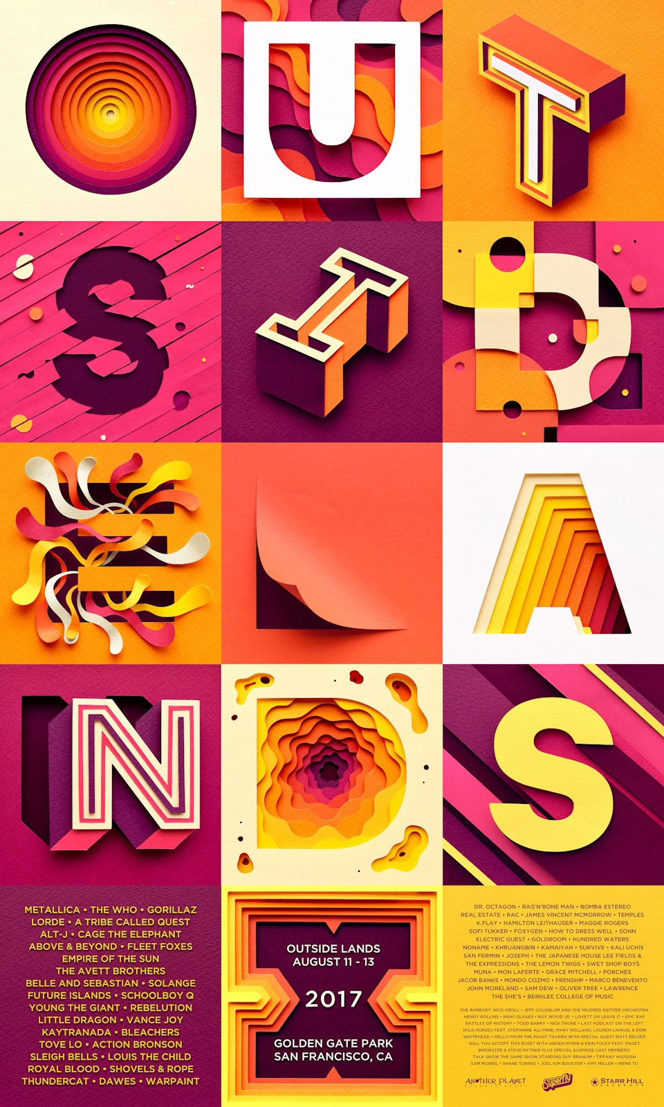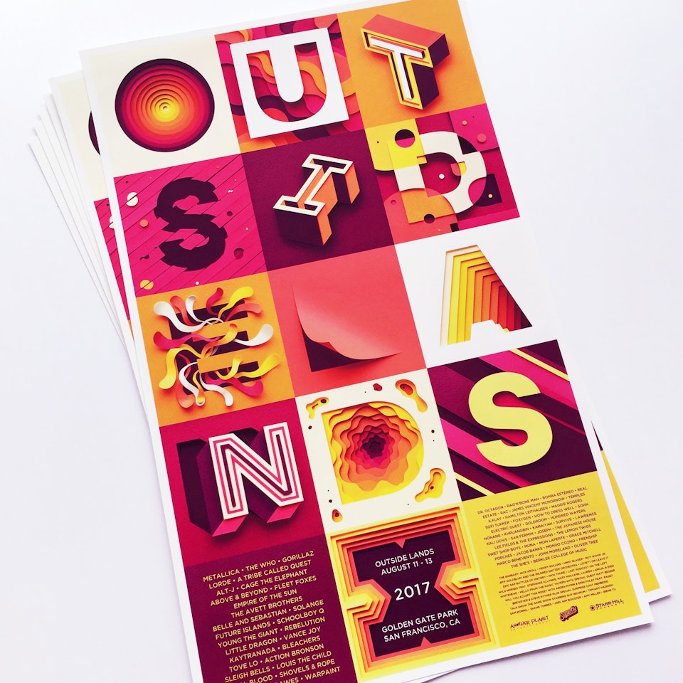 "I was approached by US promoters Another Planet Entertainment and Superfly to create a poster for the tenth edition of Outside Lands festival in San Francisco. They wanted the poster to be bold and eye-catching, as well as being an item that would work nicely on people's walls so that they could sell prints of it in their shop.