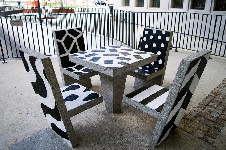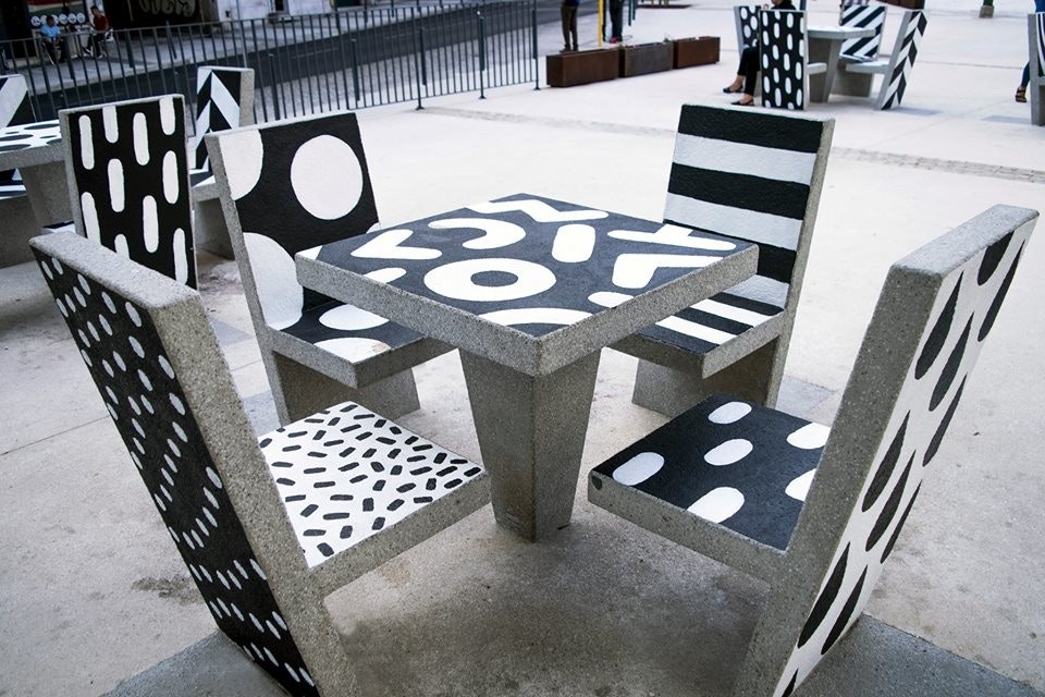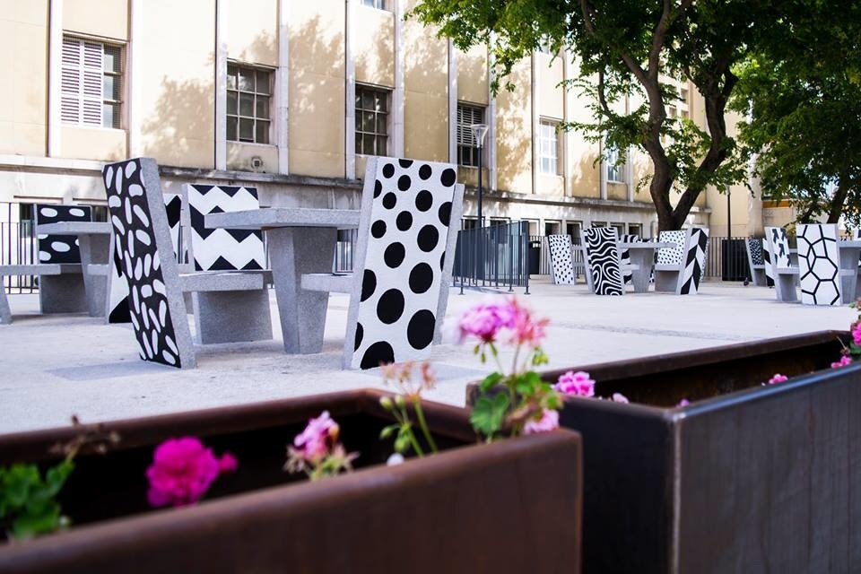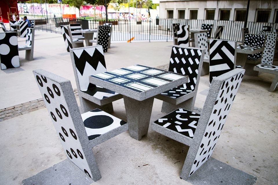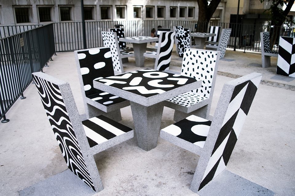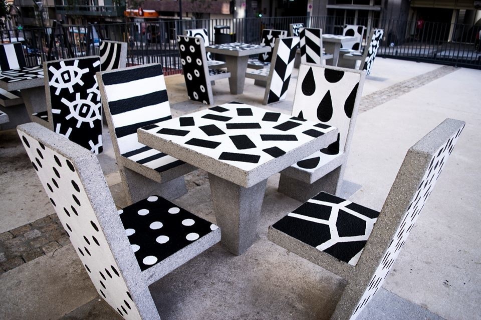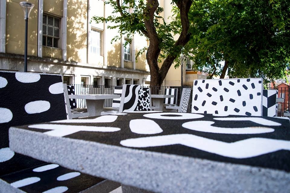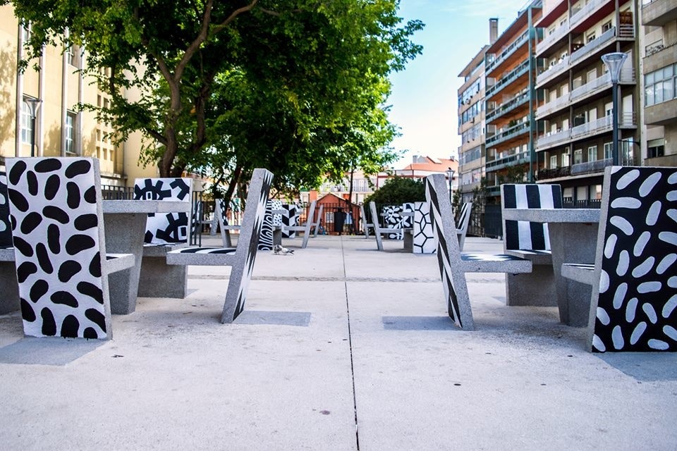 "Hand-painted cement block urban furniture for the new Campolide Parish public square. My idea was to turn these cement block chairs and tables into something more dynamic and interesting for the population. By painting a different pattern on each surface the appearance of the square would always be different depending on the angle you look at."